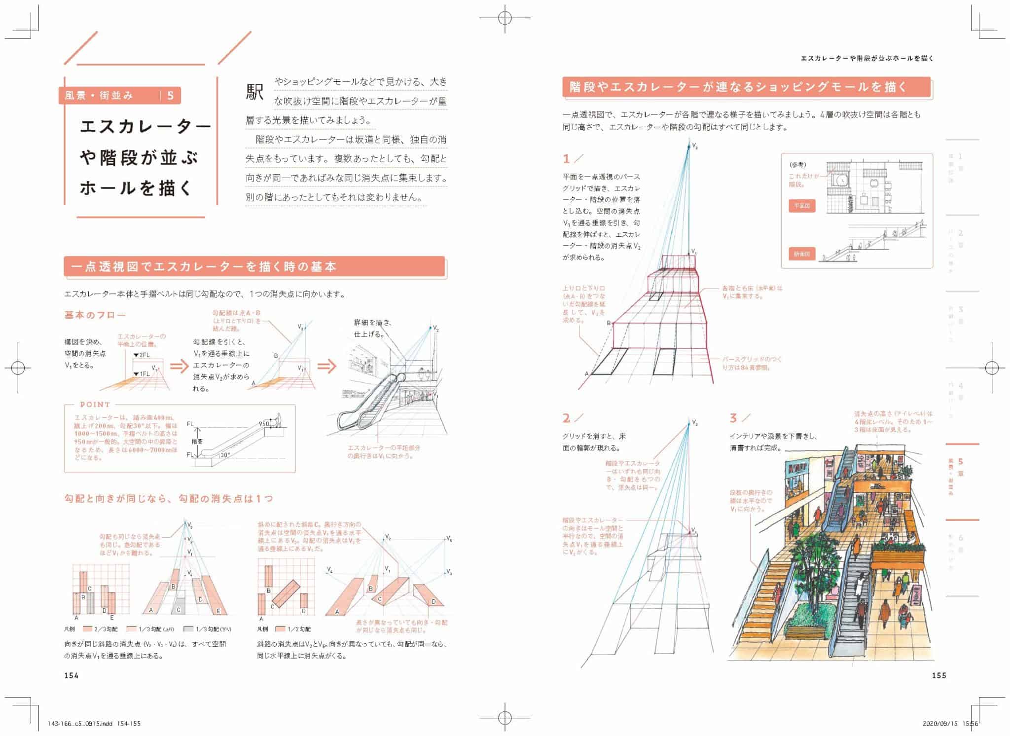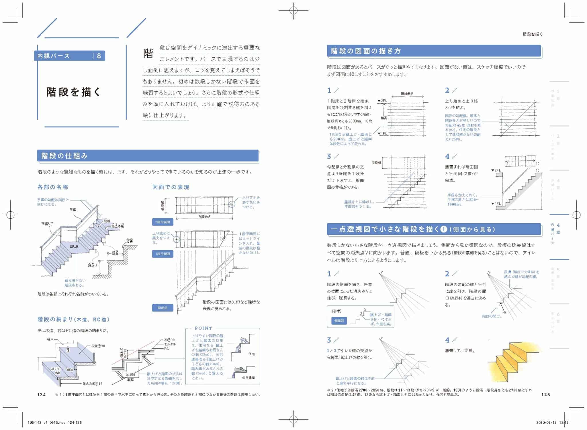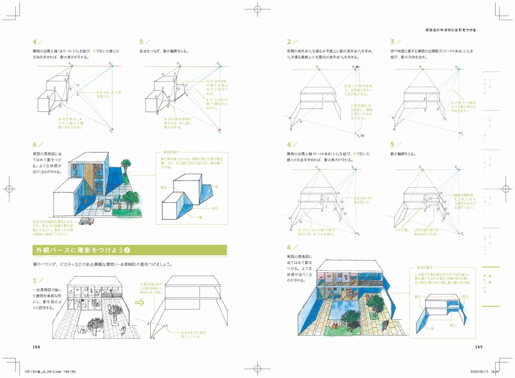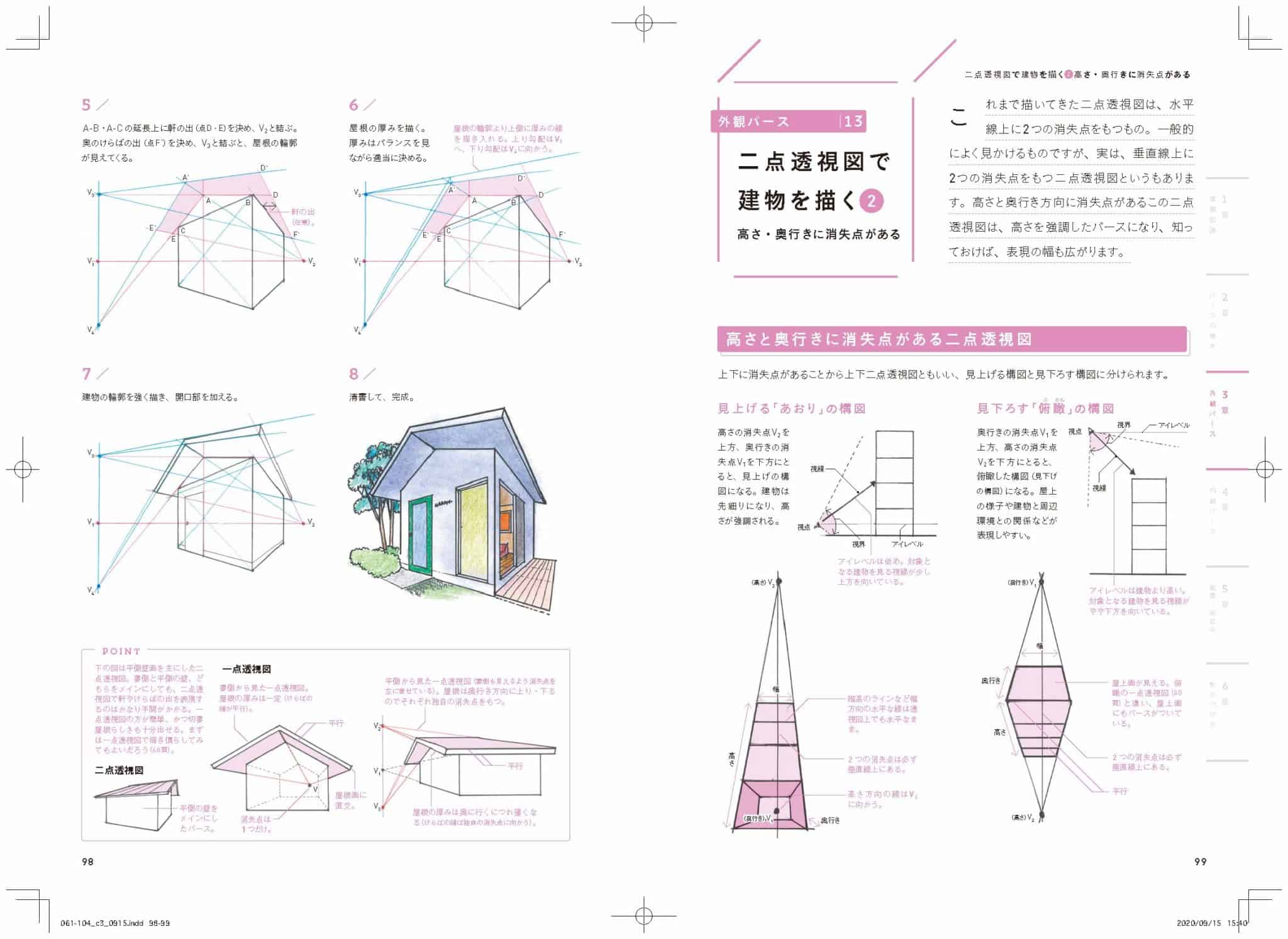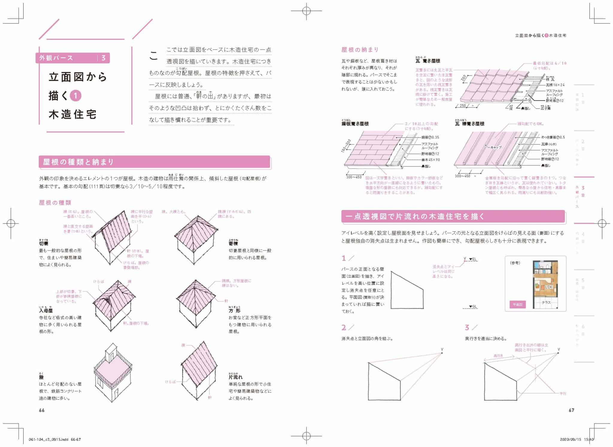 具体的には一点、二点透視図法、陰影のつけ方など図法の基本から手早くうまく描けるテクニック、建物各部位の寸法や名称までをていねいに解説しています。