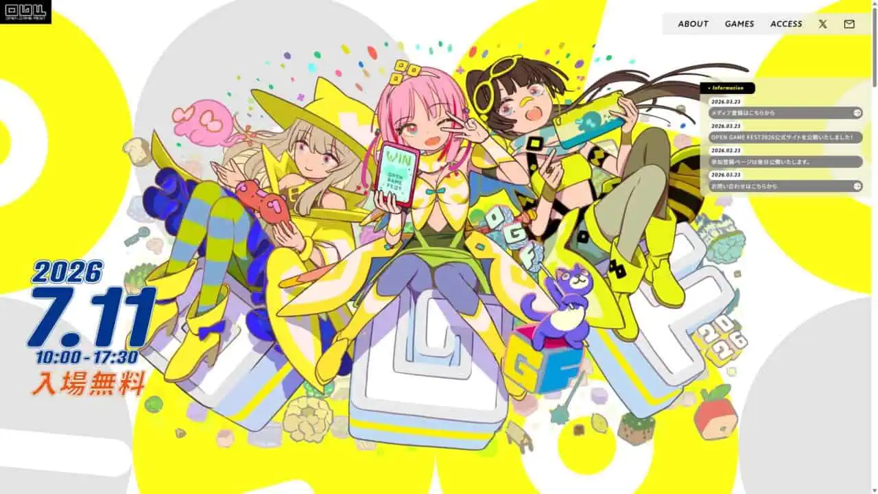| 内容 | ゲーム開発者によるセッション 内容はComing Soon インディーゲームの展示エリア 一般出展ブース62枠で出展料は無料 出展者の応募締切は2026年4月19日(日) OPEN GAME AWARD 来場者による一般投票で受賞作品が決定するゲームコンテスト |