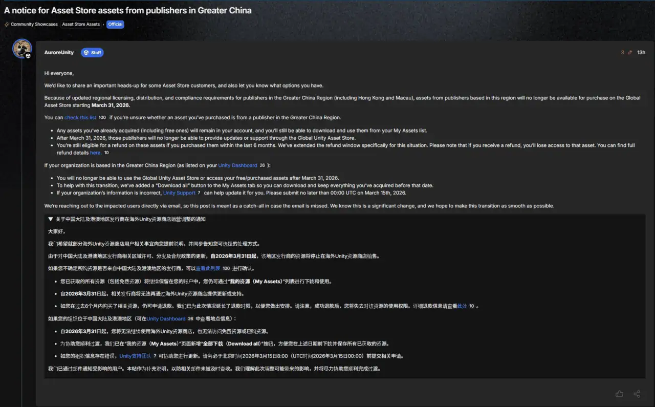 Unity Technologiesは2026年3月3日に、公式フォーラムにて中国圏発アセットが2026年3月31日移行グローバル版 Asset Storeから入手不可になることを告知しました。