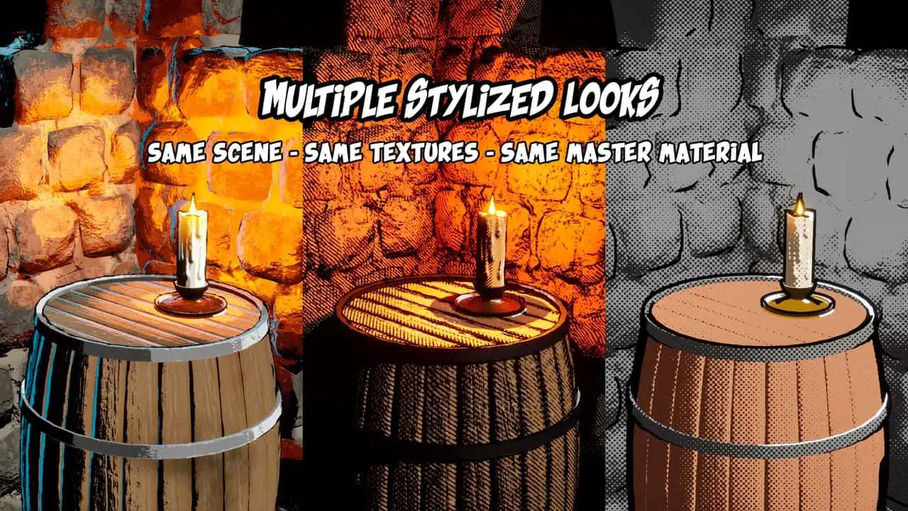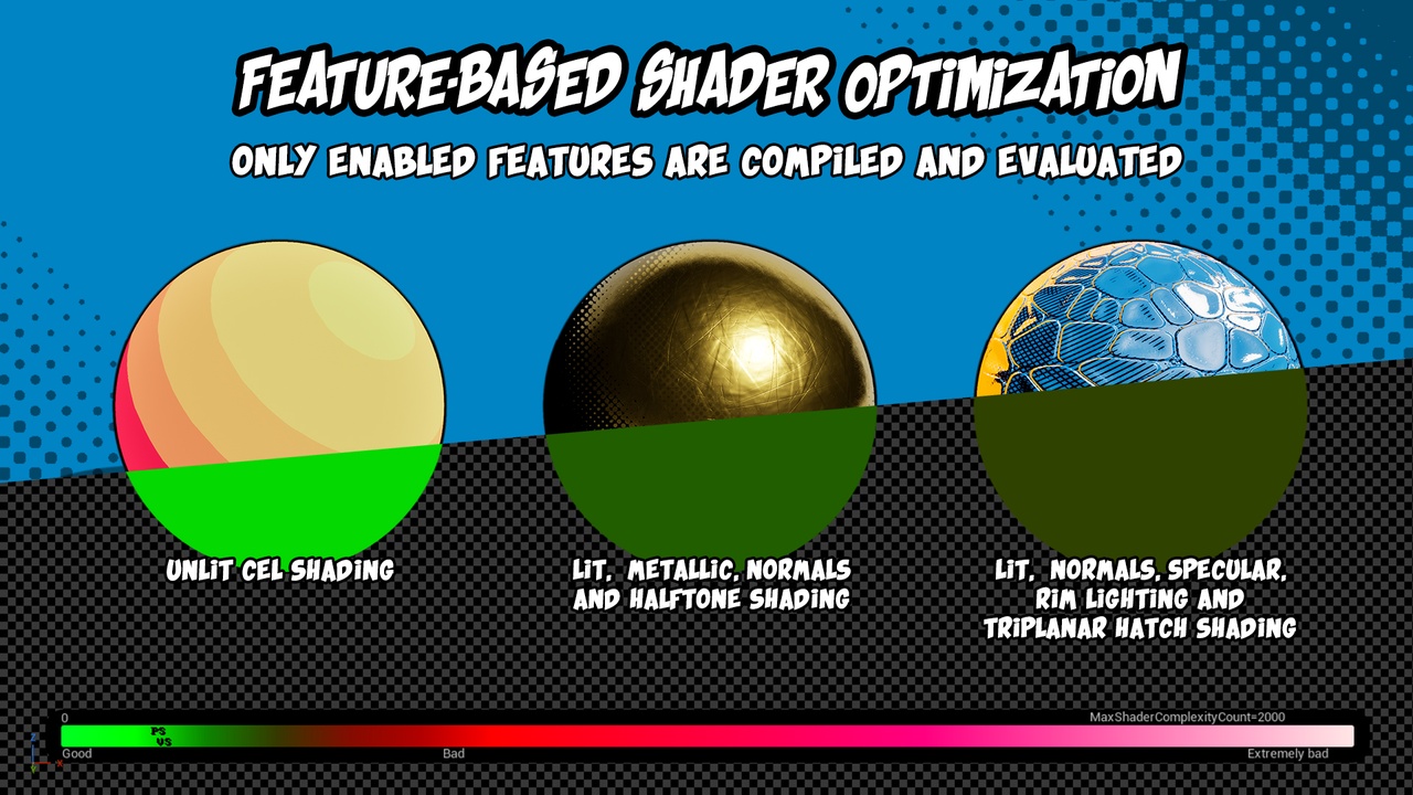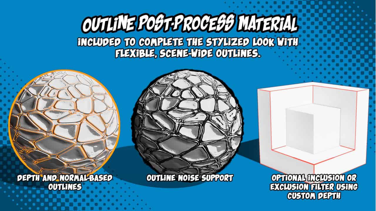 複数のスタイライズドシェーディングモード、柔軟な照明サポート、そして統一感のあるスタイライズドルックの完成を支援するアウトラインポストプロセスマテリアルがバンドルされています。セルシェーディング、イラスト調、グラフィック調、あるいはハイブリッドスタイルのいずれをターゲットとする場合でも、この素材は最適化された状態を維持しつつ、使いやすさを保ちながら、あらゆるニーズに対応できるよう設計されています。