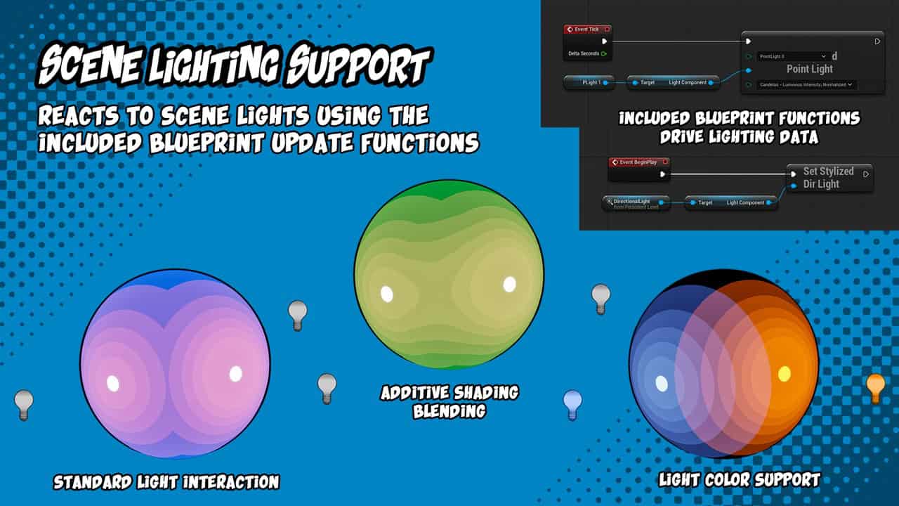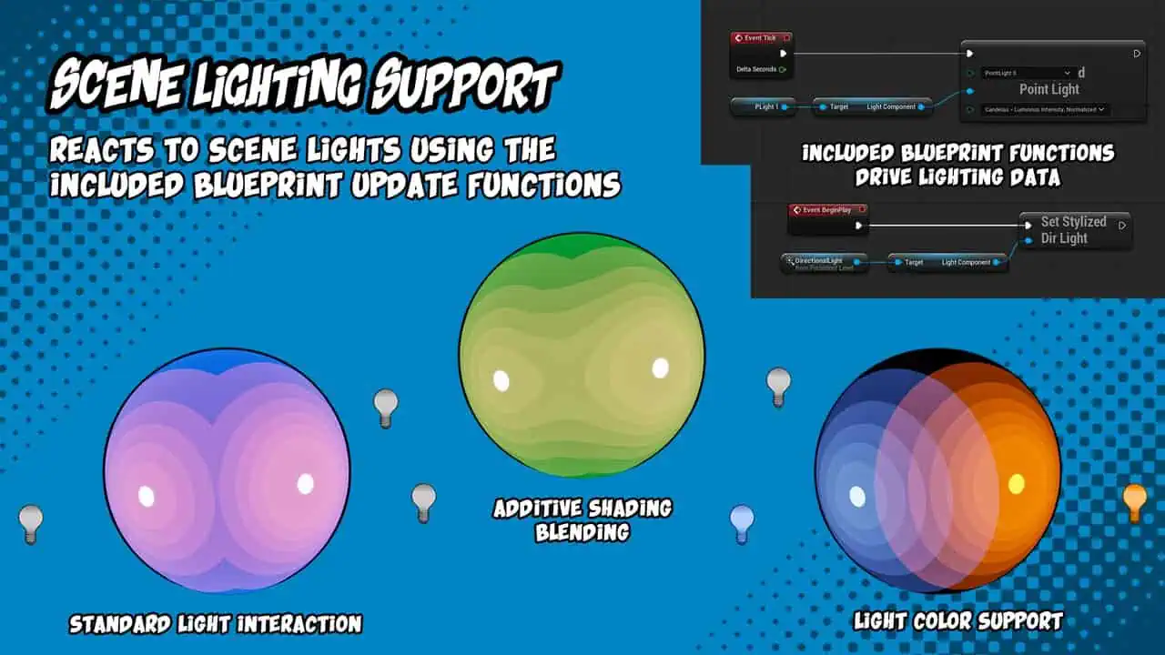 - シーン照明サポート:照明データをマテリアルパラメータコレクションに書き込むブループリントヘルパー関数を内蔵し、動的なシーン照明をサポートします。ディレクショナルライト、最大10個のポイントライトのスロットを搭載