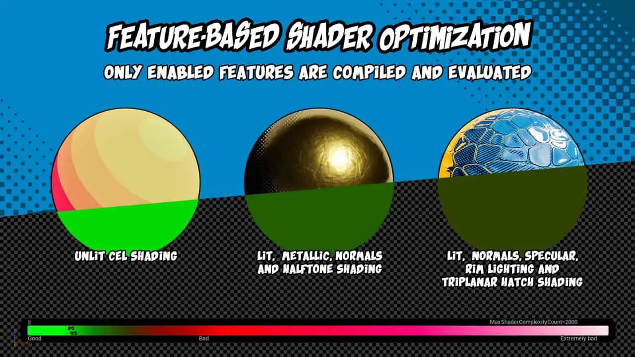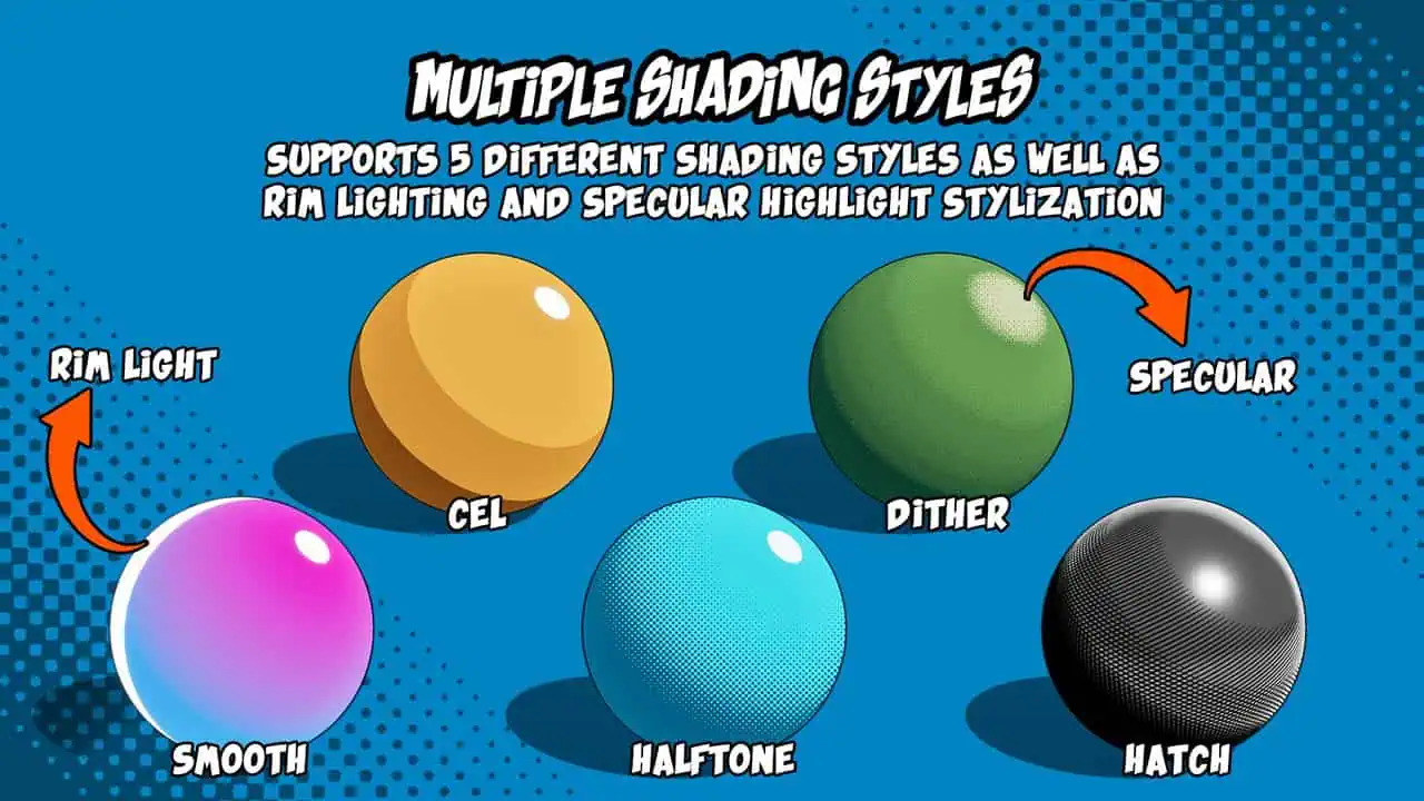 - 追加のスタイル設定機能:カスタマイズ可能なシェーディングの色と強度、ディザまたはハーフトーン効果付きスクリーンスペース・リムライティング、スタイライズド鏡面反射ハイライト