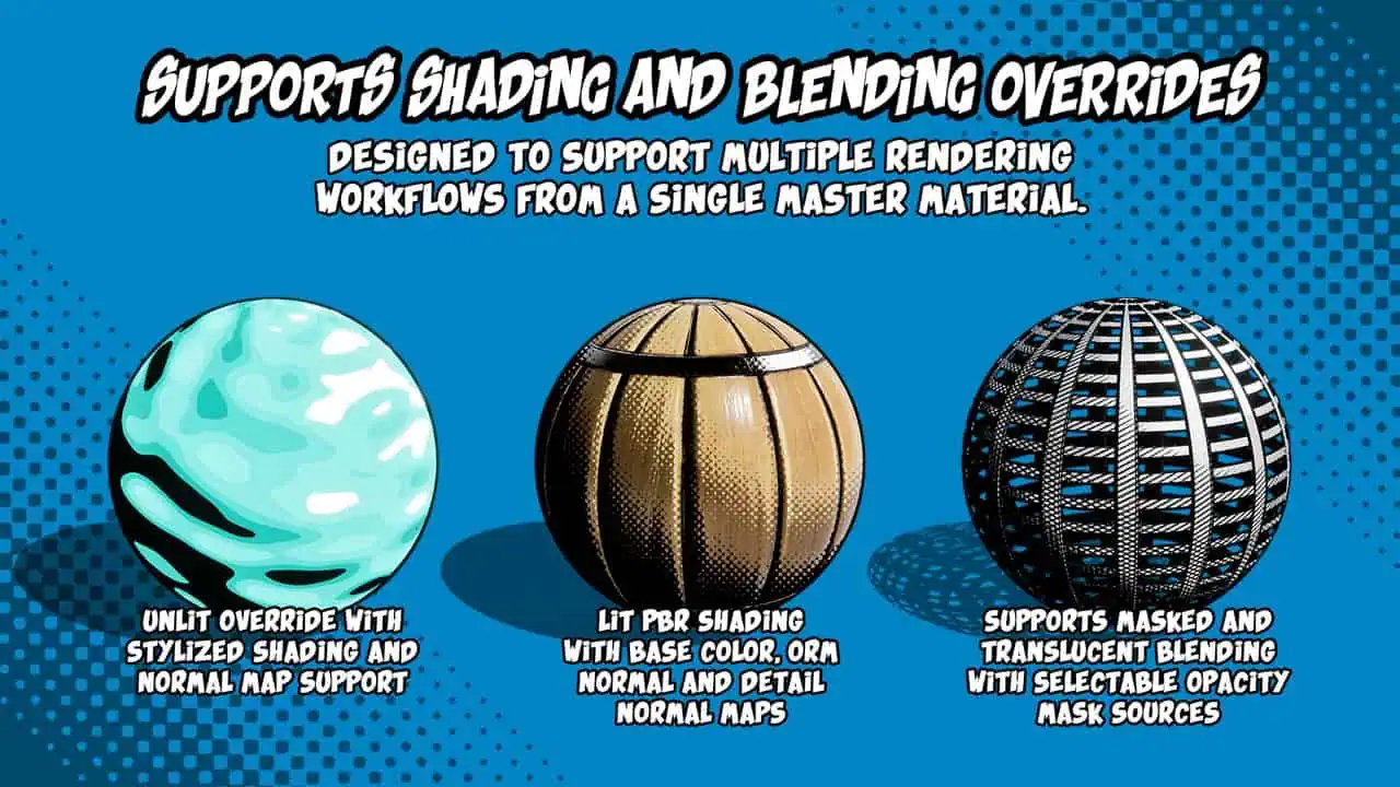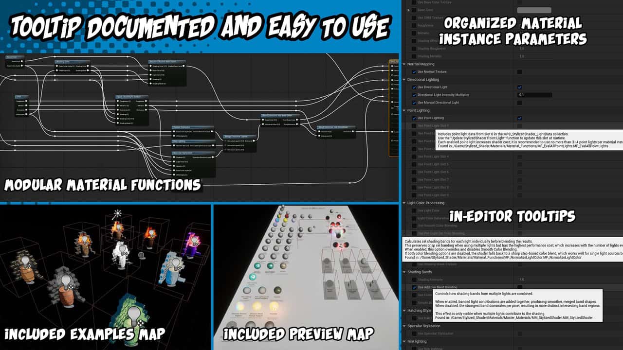 本製品は、Unreal Engine向けの単一で強力かつ高度にカスタマイズ可能なスタイライズドマスターマテリアルです。照明、シェーディング、パフォーマンスを完全に制御し、幅広いビジュアルスタイルと制作ワークフローをサポートするように設計されています。