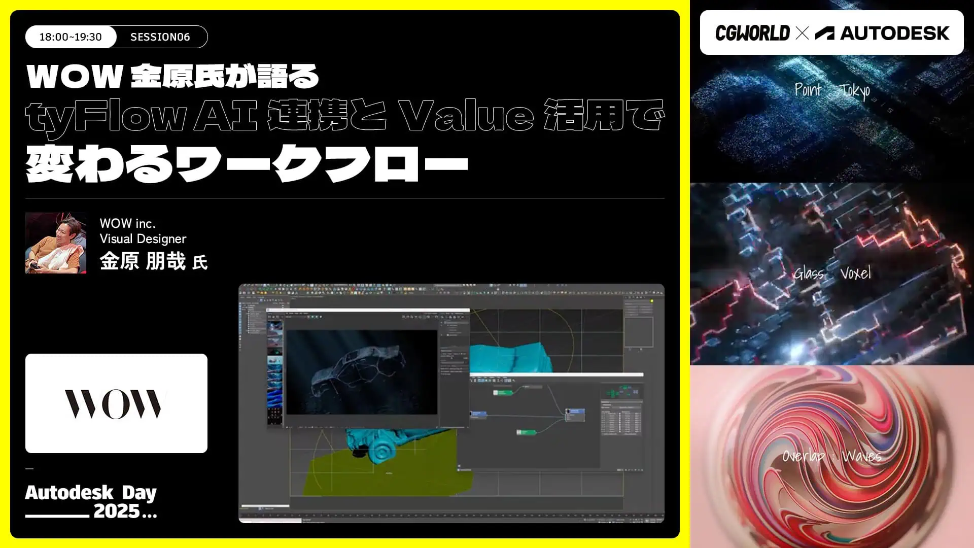 18:00~19:30 WOW 金原氏が語るtyFlow AI連携とValue活用で変わるワークフロー 3ds MaxとtyFlowを自在に操るWOWの金原氏が、以下の3本立てで活用事例をお届けします。 ・tyFlowとAIで作るシネマティック導入 ・Valueオペレーターによる革命 ・tyFlow モディファイアの小技 |