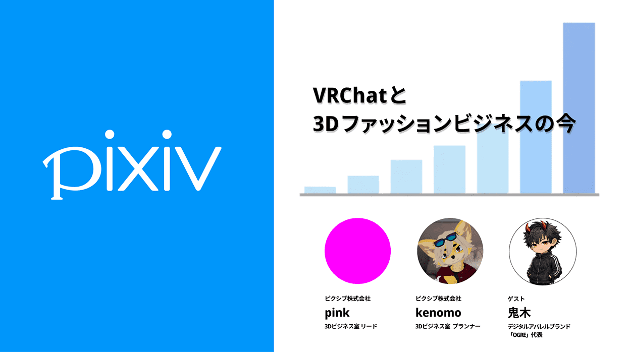 2025年、BOOTHにおける3Dモデルカテゴリの取扱高は100億円を突破。VRChatを中心とした3Dファッション市場は、今やプロのアーティストにとっても無視できない、表現とビジネスが直結する巨大な創作圏へと成長している。ピクシブの3Dビジネス室メンバーと「OGRE」を主宰する鬼木氏が登壇し、最新の市場データやコミュニティの熱量を共有するとともに、3Dファッション制作・販売手法の「今」を紐解く。