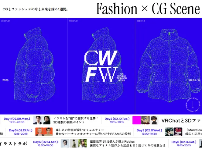 2026年2月9日(月)から7日連続で「CGOWRLD Fashin Week」というイベントがオンライン開催されます!ファッション&CGを中心とした様々なコンテンツが配信されたり、リアルイベントなどもあるそうですよ!