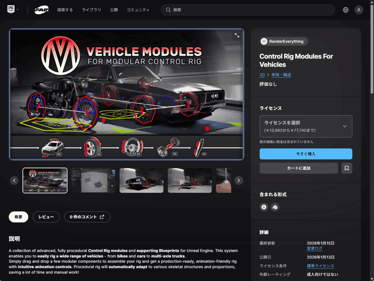 「Control Rig Modules For Vehicles」はFab上で個人向けが$89.99、プロ向けが$499.99で販売中!