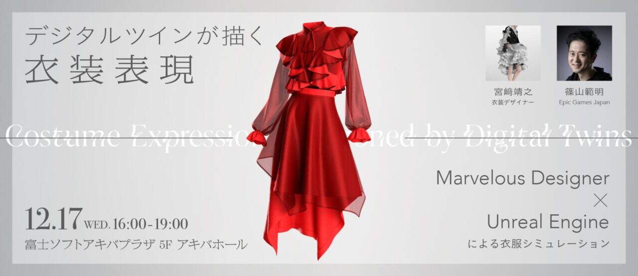 2025年12月17日に富士ソフトアキバプラザ 5F アキバホールにて開催される無料のイベント「デジタルツインが描く衣装表現 Marvelous Designer × Unreal Engineによる衣服シミュレーション」のご紹介!CLO/Marvelous Designer/Unreal Engineを使用した衣装制作の最先端表現技法を解説する無料イベントですよ!!