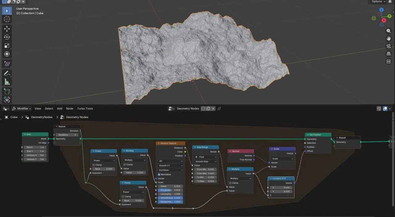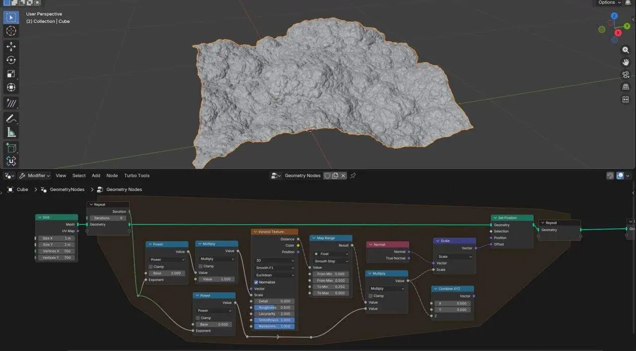 CGMatterのセカンドチャンネルDefault Cubeにてハイトマップ&GeometryNodesをつかった表現テクニックが紹介されております!