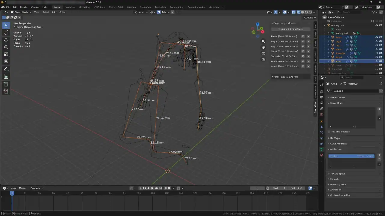 選択したメッシュオブジェクトを登録し、個々のエッジの長さや総エッジ長を3Dビューポートおよびサイドバーに直接表示するBlenderアドオンです。精密な測定、モデリング解析、および技術的なワークフロー向けに設計されています。評価済み依存関係グラフのデータを使用し、モディファイアによって変形されたジオメトリを完全にサポートします。