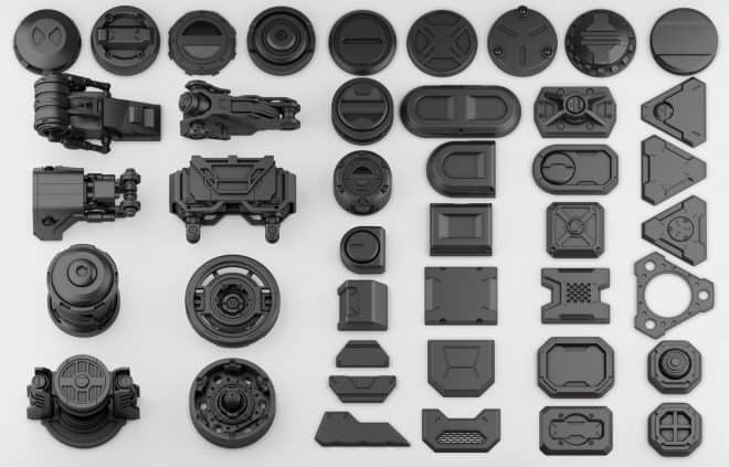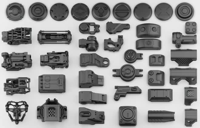 Oleg Ushenok氏による、Fusion 360と3ds Maxで作成されたハードサーフェスKitbashパック「FREE Hard Surface Kitbash Vol. 1」