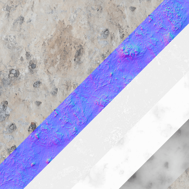 基本的にノーマルマップ、アルベドマップ、ラフネスマップ、メタリックマップ、アンビエントオクルージョンマップ、高さマップ等を、PNG形式で2048×2048ピクセルで収録。またUnity向けにメタリックマップのアルファチャンネルにスムーズにネスマップを格納したPSDファイル等もあるそうです。
