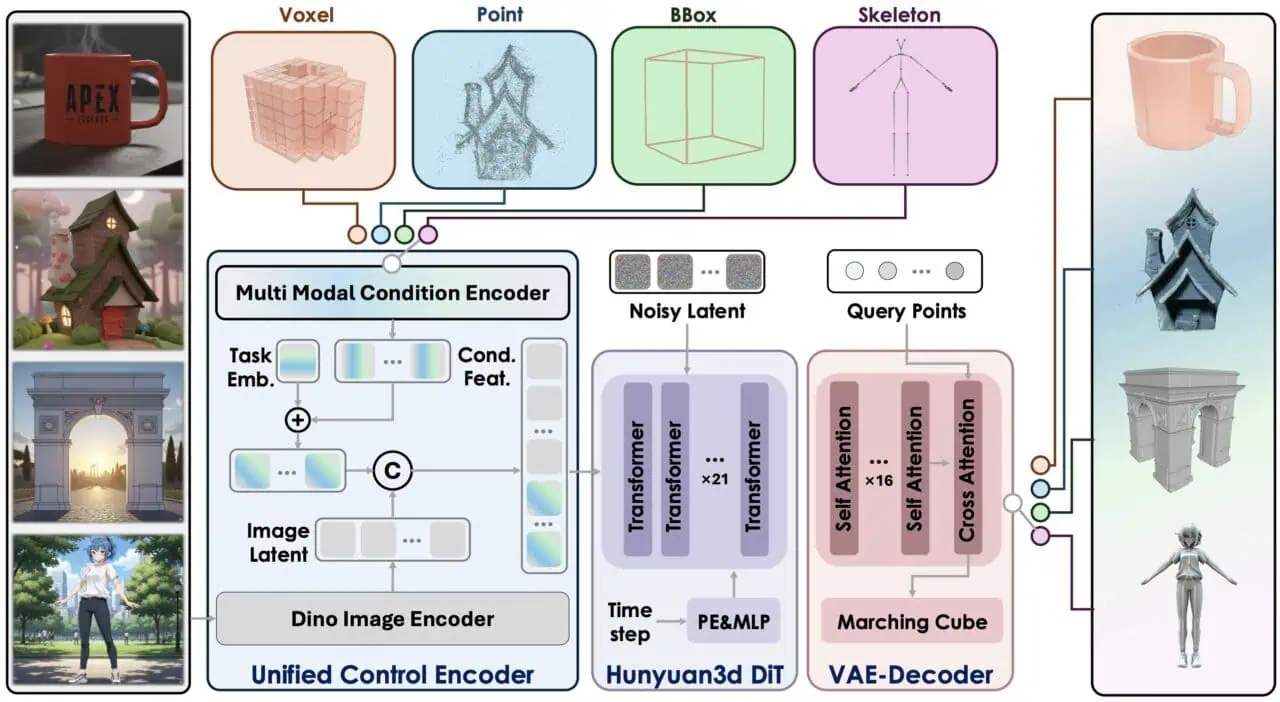 3Dの「ControlNet」としてオープンソースのHunyuan3D 2.1に基づいて構築され、最大4つの制御条件を統合することで、シングルビューのオクルージョンや貧弱なジオメトリに対処します。効率的なマルチモーダル融合のための軽量統合制御エンコーダーと、ロバスト性を高めるプログレッシブ難易度考慮トレーニング戦略です。✅単一画像条件下では、骨格入力はアニメーションやアバターの正確なポーズ制御を提供する。