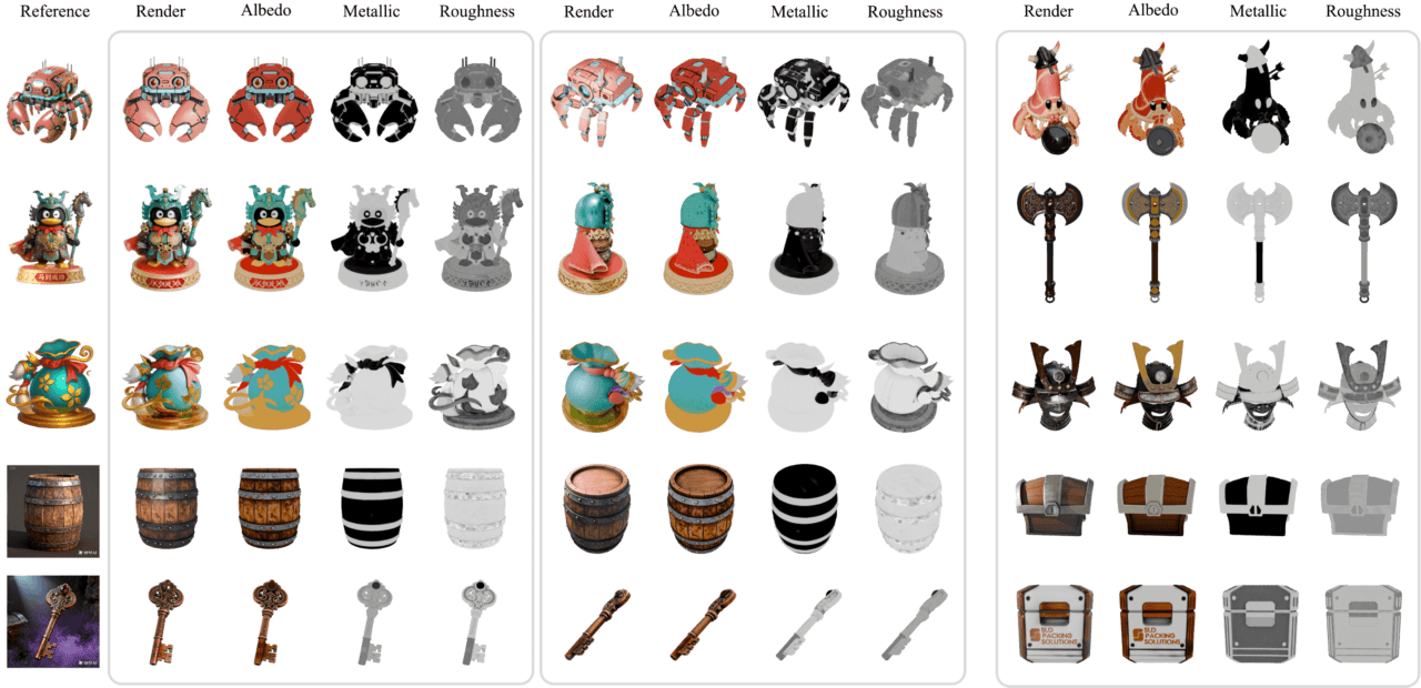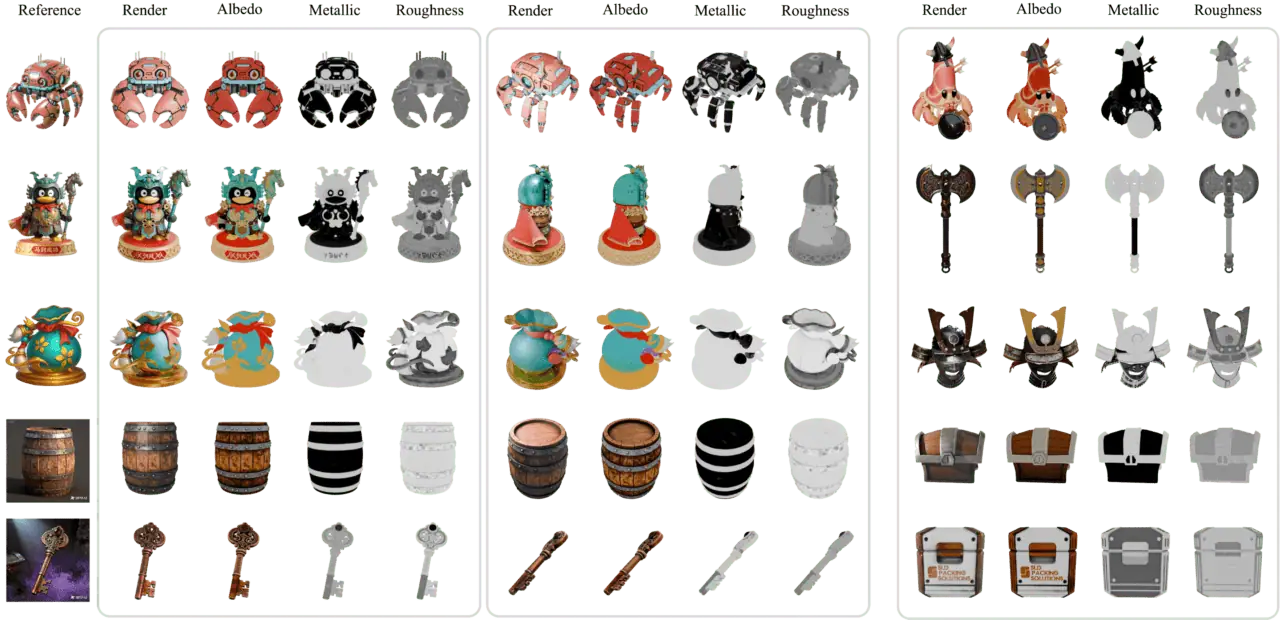 (2) 照明を意識したマテリアルアテンション機構: 照明コンテキストを復号プロセスに注入し、物理的に根拠のあるアルベド・金属性・ラフネスマップを生成する。
