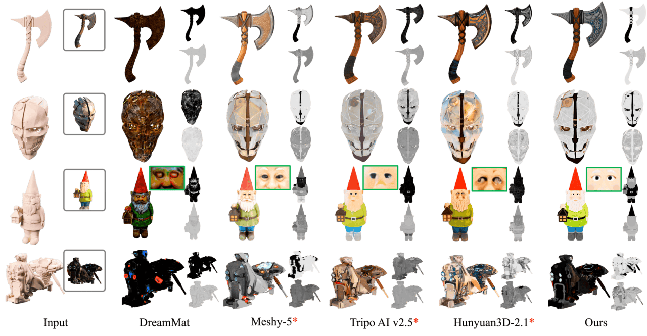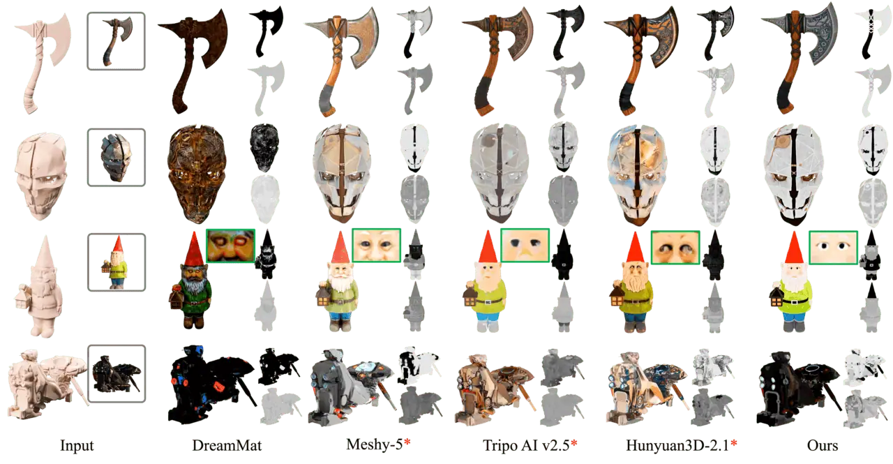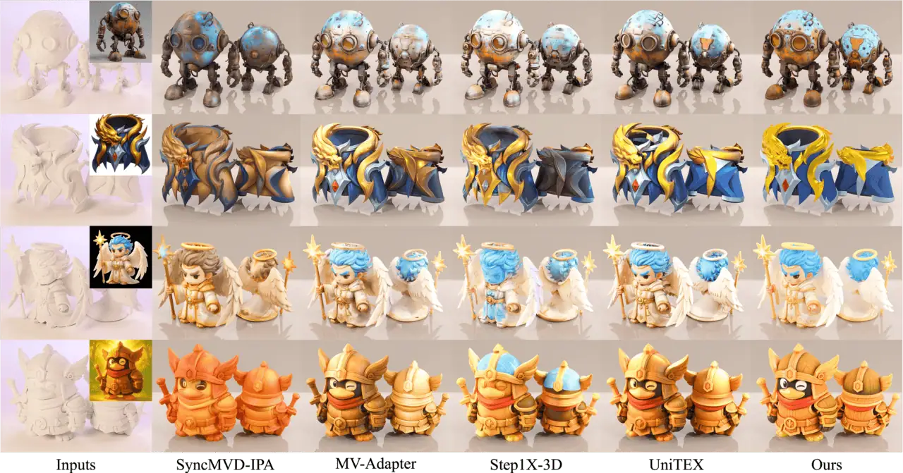 (3) 幾何学情報に基づく補完モジュール: 広視野合成モデルに基づき、テクスチャカバレッジを強化し、シームレスで視点一貫性のあるUV補完を保証する。広範な実験により、LumiTexがテクスチャ品質において最先端性能を達成し、既存のオープンソース手法と商用手法の両方を凌駕することが実証された。