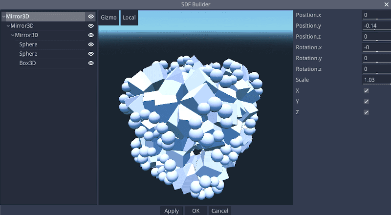 - EasySDFノードが3Dプリミティブ、オペレータ、トランスフォームで拡張:複雑なレイマルシェ図形を作成するために使用可能