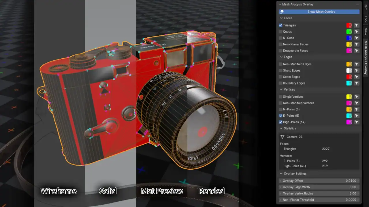 DShot92氏による、四角・三角・NGon・NPoleなどのメッシュの状態をオーバーレイ表示し可視化出来る無料のBlenderアドオン「Mesh Analysis Overlay」がBlender Extensionsから利用可能です!!