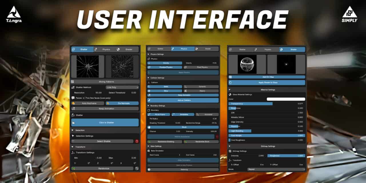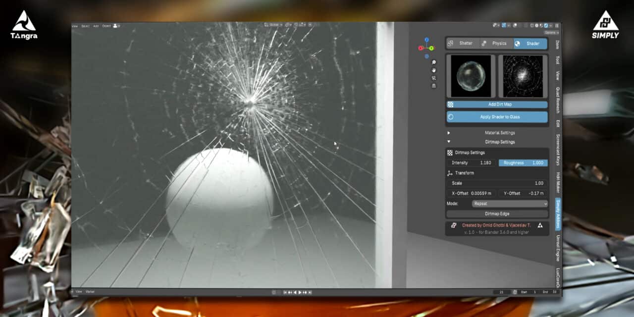 Simply ShatterはTAngraFX & Simplyによって開発されたBlenderアドオンで、リアルで完全に制御可能な粉砕エフェクトを作成するために設計されています。ガラス、オブジェクト、その他のマテリアルを問わず、このツールは自然な破砕パターンを簡単に生成し、物理ベースのシミュレーションで生命を吹き込みます。