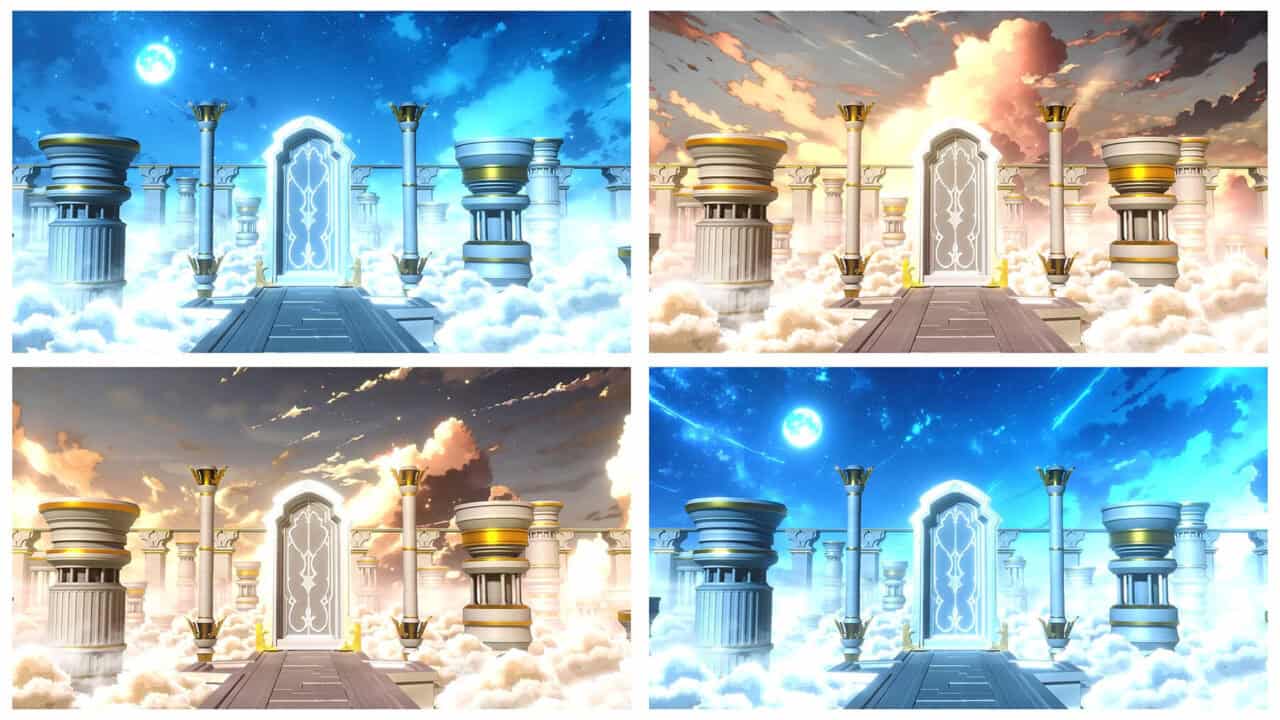 その後、最終的なスタイライズ段階に取り掛かります。体積フォグ、雲の層、映画的な照明を追加し、明るく幻想的な雰囲気を創出します。これらの要素がシーンに夢のようなアニメ風の趣を与え、ファンタジー世界を真に生き生きと表現します。
