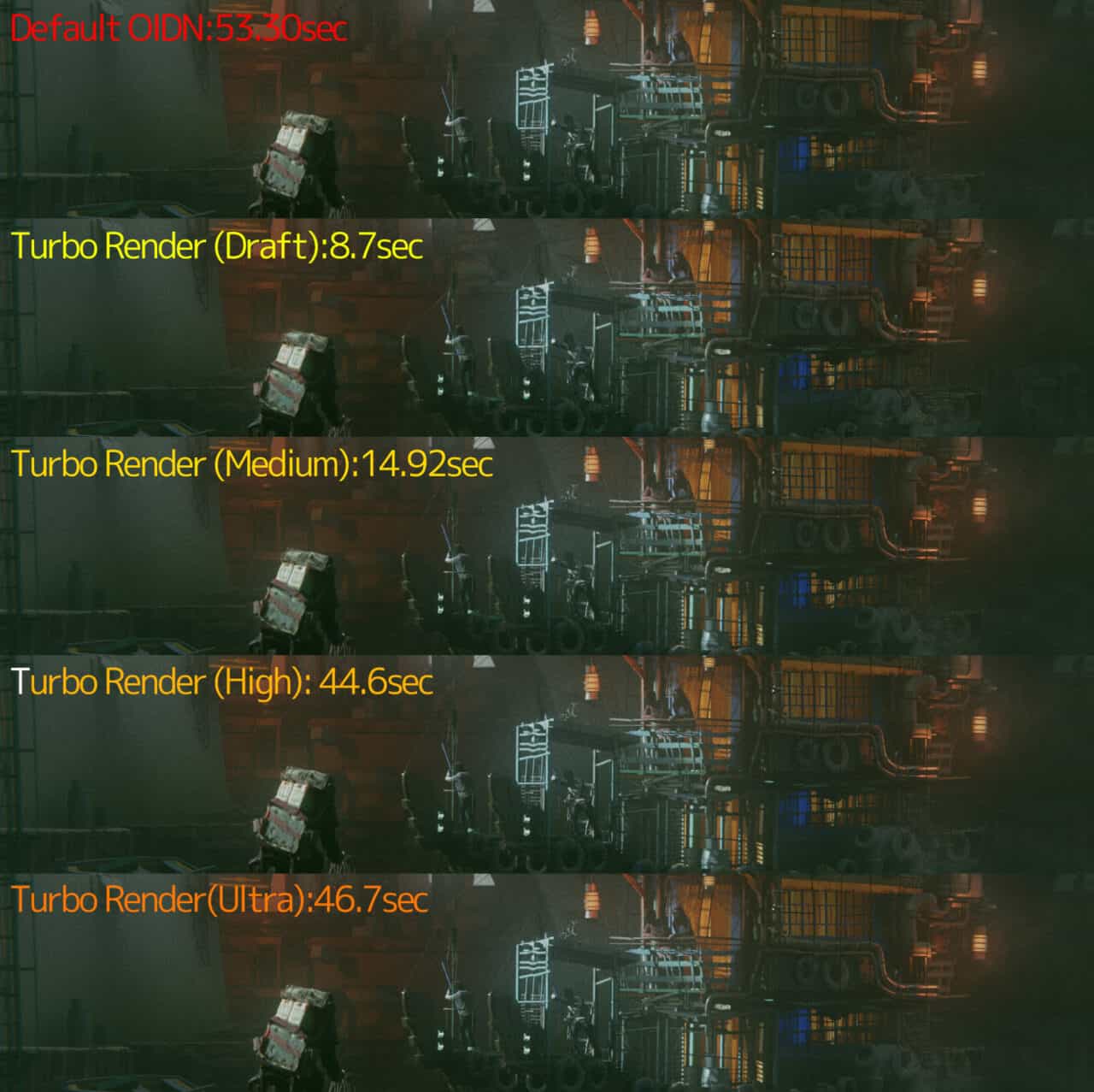 シンプルな設定項目で、レンダリングを最適化状態に出来ます。細かなレンダリング設定画面と睨めっこする必要無くともレンダリング速度を向上することが出来る…とのこと。ちなみに最大960倍というのは、デノイザー未使用時との比較みたいですね。OIDN/Optpixデノイザ使用時と比較した際には最大120倍早くなるそうです。