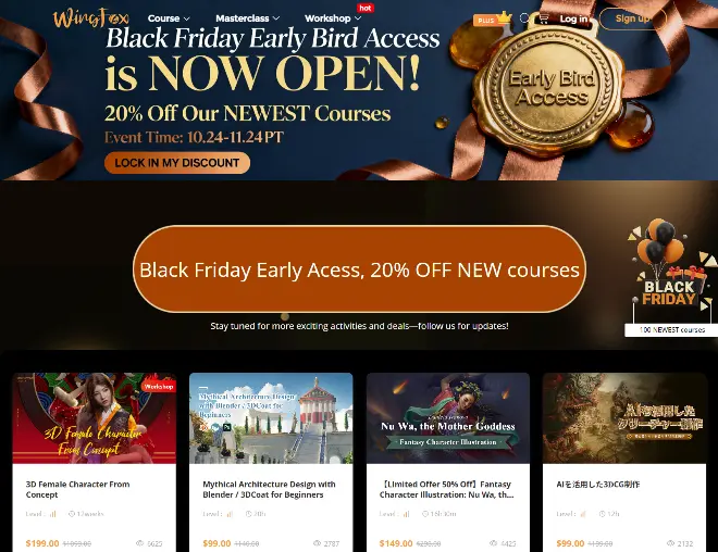 CG&デジタルアート関連チュートリアルサービス「Wingfox」にてブラックフライデー早期アクセス関連セールが実施中で新コースの各種が20%OFFで入手できるようです❗️!